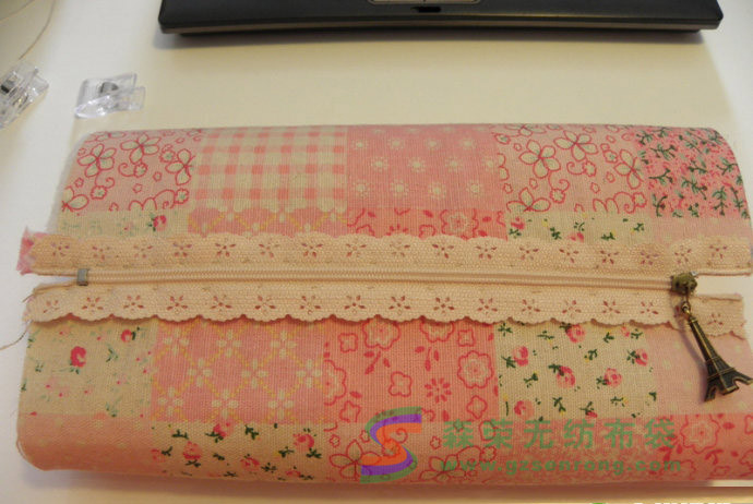 這款化妝包最大的優點在于包型簡單,表布,里布和鋪棉只需要裁成矩形或者正方形即可。至于長寬的尺寸,建議大概在20cm左右即可。將表布,鋪棉和里布對好,在裁的時候注意表布由于要包過來,而且考慮到鋪棉的厚度,可以比里布的長度略長,但也不是必須。鋪棉如果是帶膠的,就直接熨好使三層粘合好。不是帶膠的也沒關系。